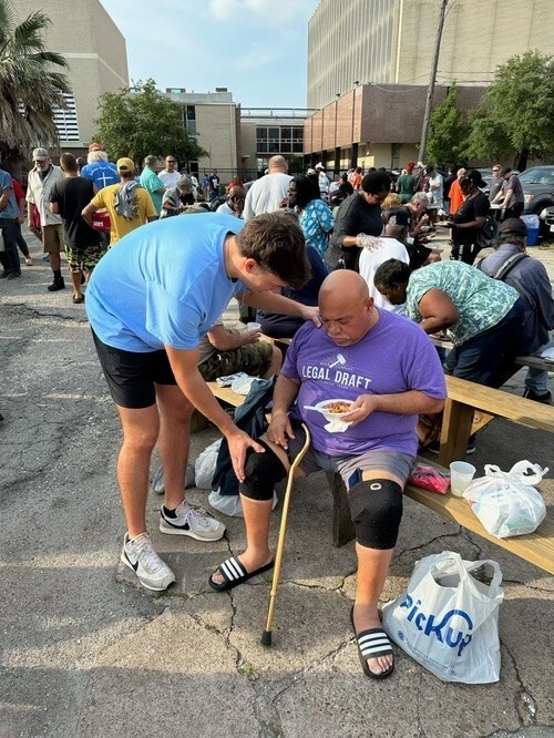 A team from Dominion Church travels to Galveston on the fourth Saturday of each month to distribute food and present the Gospel message to men and women on the island who are in need. Volunteers pray with people, serve food, and encourage people by building connections.